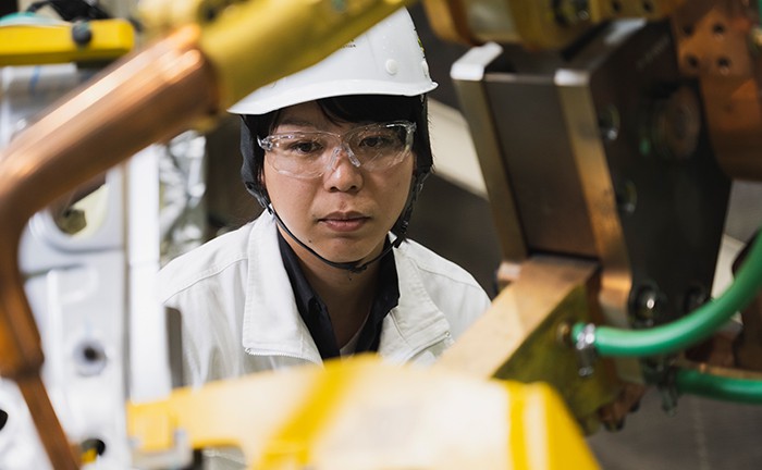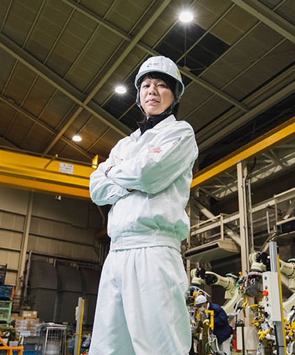 機械工学科出身。入社以来、溶接の設備(ロボット・治具)の推進・導入、ロボットティーチングを行い、効率の良い量産現場を構築している。