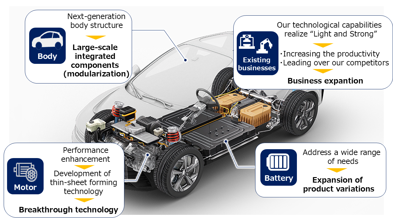 As integration between the vehicle body and the battery housing increases, the role of reinforcing materials becomes ever more important. We envisioned products that would surpass conventional ones in energy absorption, productivity, and sustainability, and initiated their development.