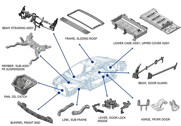 In addition to structural components, we manufacture products that leverage press forming. By replacing conventional methods with press forming, we help improve productivity and reduce costs.