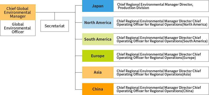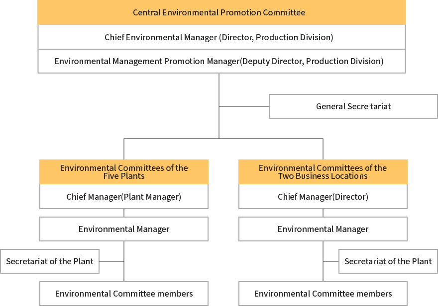 Each plant is making ongoing efforts to promote environmental compliance and improvement activities on an environmental management system (EMS) Environmental Committee basis with the respective Plant Manager serving concurrently as the Chief Environmental Manager. The Company has established the Central Environmental Promotion Committee (officer in charge: Takuto Fujii, Officer of the Company) as an upper-level organization of the plants and two additional business locations, specifically the Head Office and C&C Tochigi, to manage matters related to company-wide global environmental improvement activities.