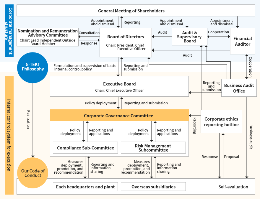 G-TEKT has adopted an Audit & Supervisory Board system. The Audit & Supervisory Board is comprised of four Audit & Supervisory Board Members. Full-time Audit & Supervisory Board Members (two persons) who are familiar with the Company's business take on the role of collecting information necessary for audits, and the Outside Audit & Supervisory Board Members (two persons) bring advanced expertise to audits based on their knowledge of finance, accounting, legal affairs, etc. In doing so, they are responsible for appropriate and useful deliberation and supervision and auditing of execution.