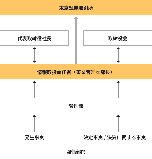当社は、取締役事業管理本部長(情報取扱責任者)がIR実務を統括し、IR担当は社内各部門と定期的に情報交換を行い、有機的な連携体制を構築します。