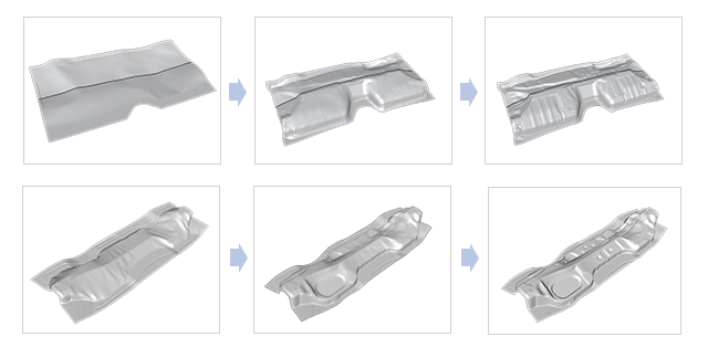 車体部品は複雑な形状となっているため、平らな鋼材を複数のプレス工程により成形し、段階的に完成品に仕上げていきますが、事前にプレス成形シミュレーションを行なうことで、よりスピーディーな製品開発を可能にすると共に、高品質な製品を生み出す金型造りと最適な加工法の開発を実現しています。